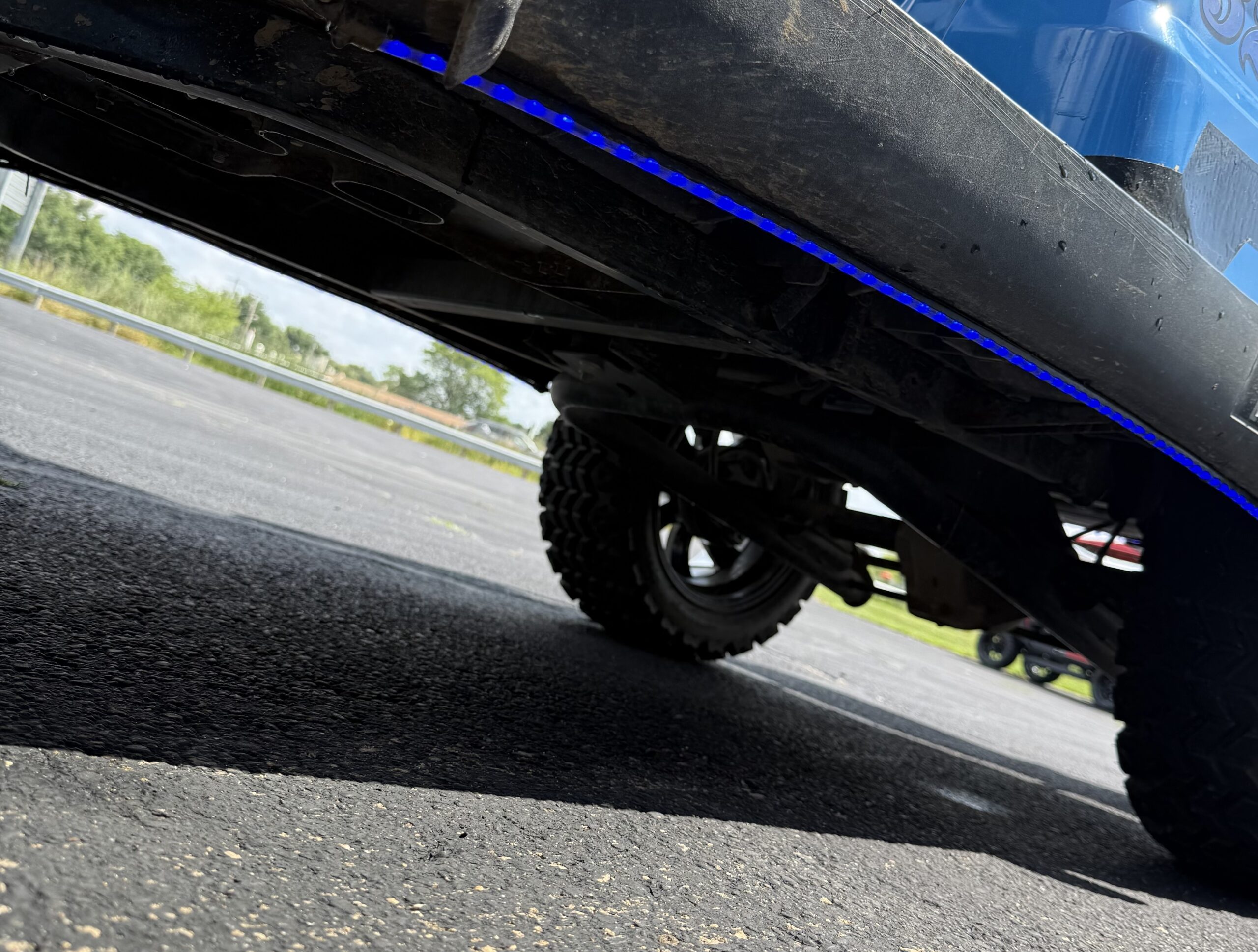 Performance upgrades include a new Model XCT48300-YDRE DC controller with adjustable speed and regenerative braking controls for improved efficiency and drivability. This cart also features new wheels, a roof-mounted LED light bar, underglow lighting, air horn, trailer hitch, and an upgraded soundbar system.