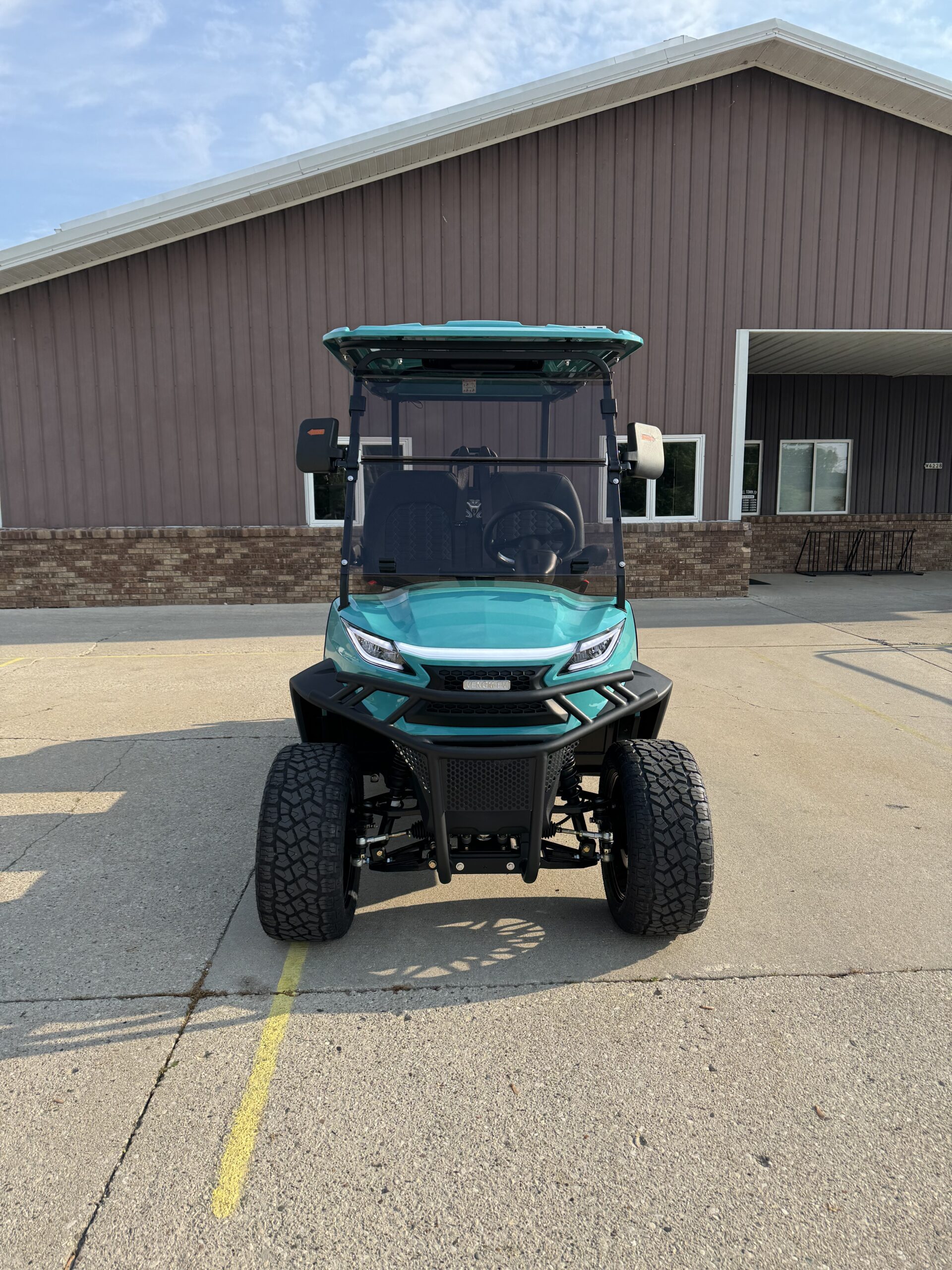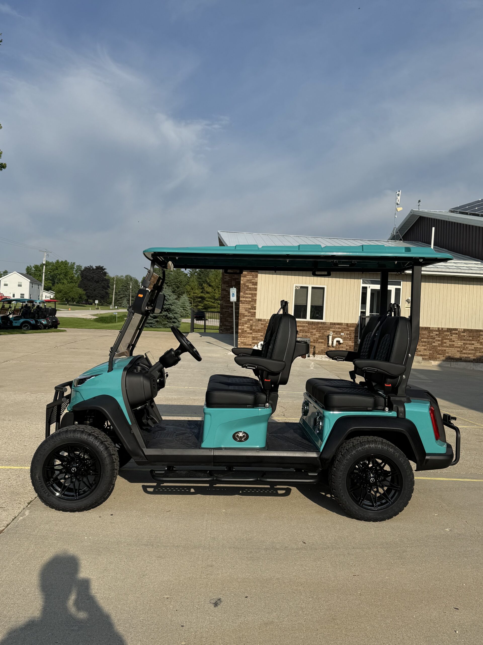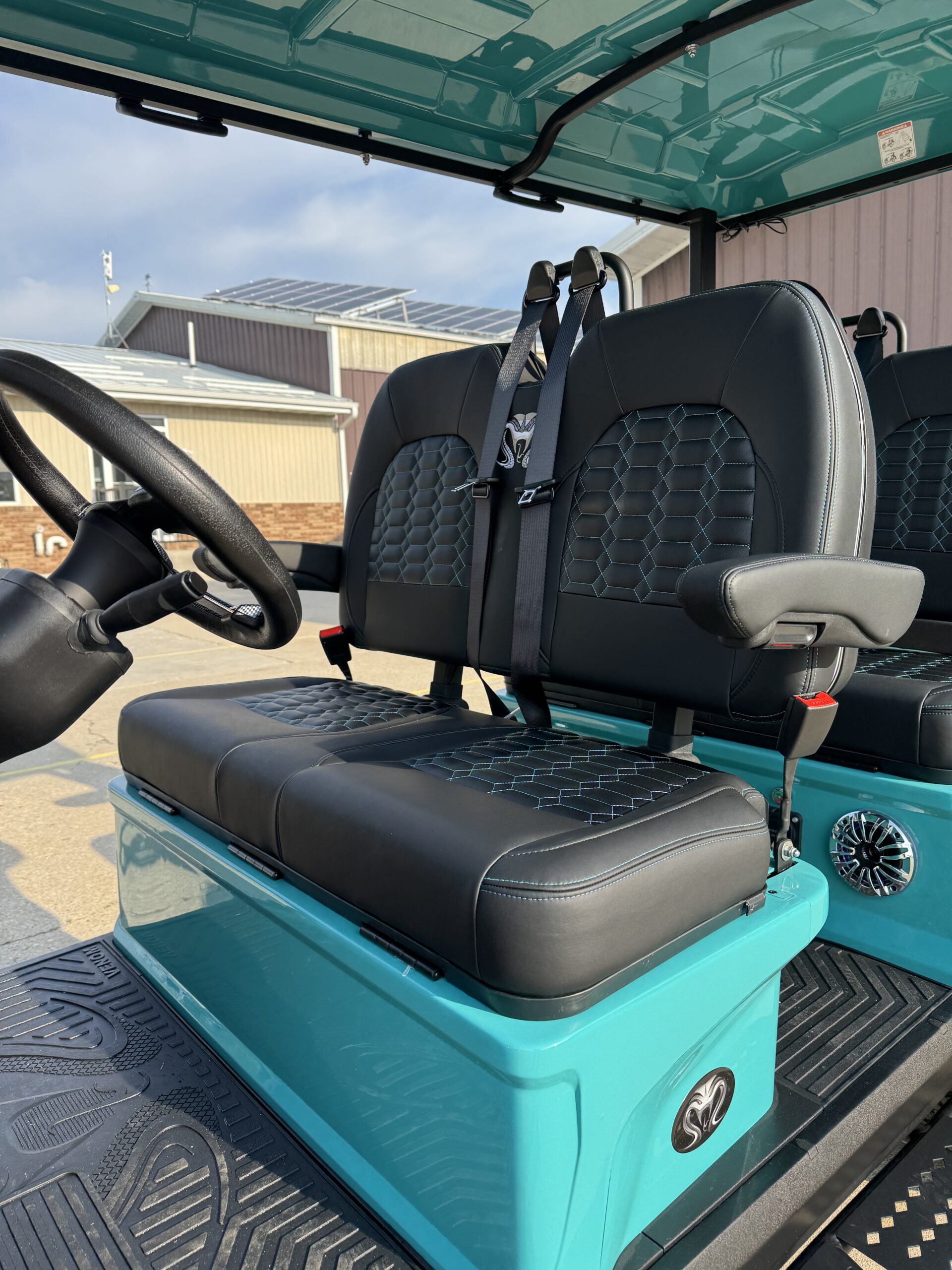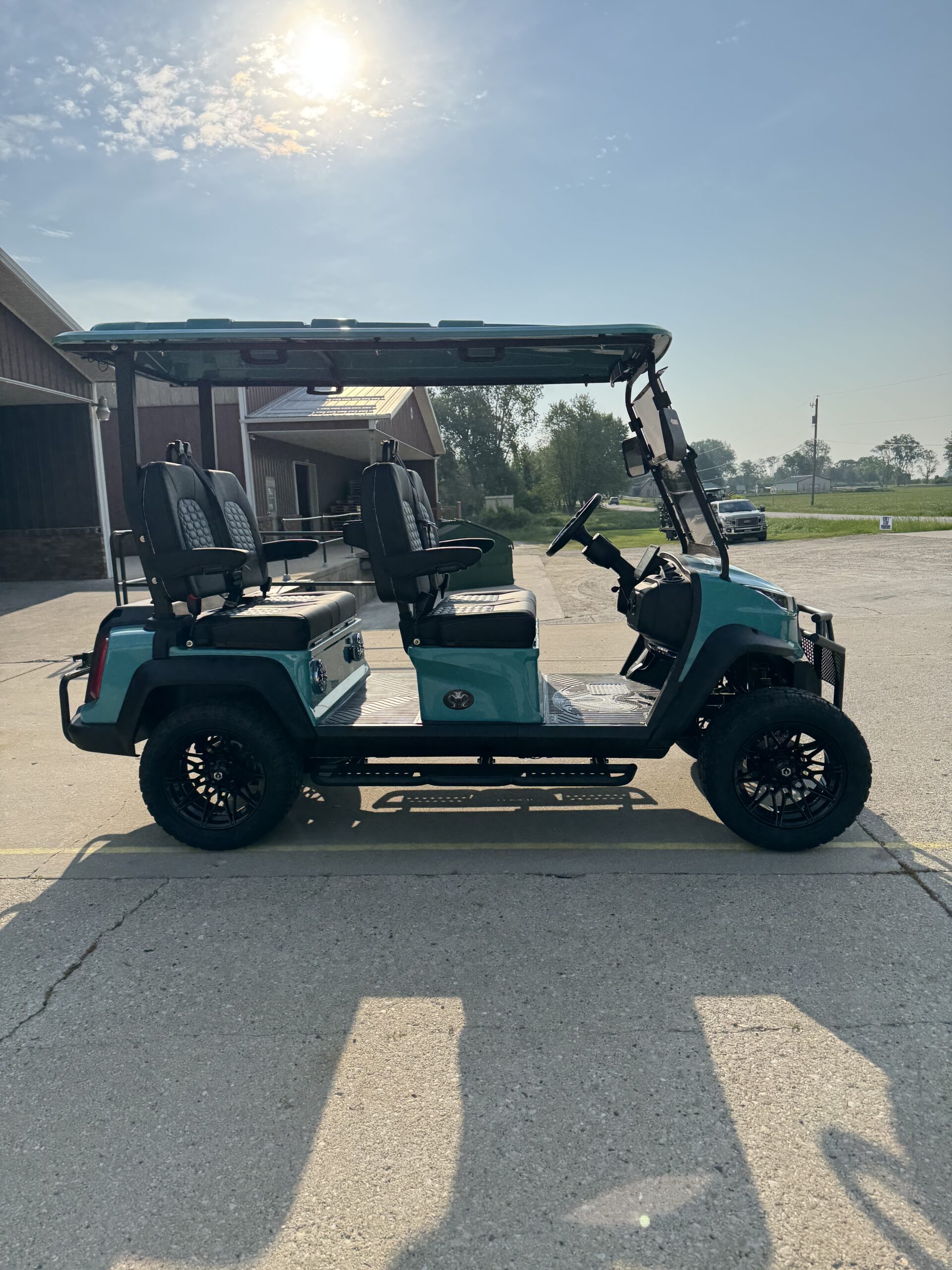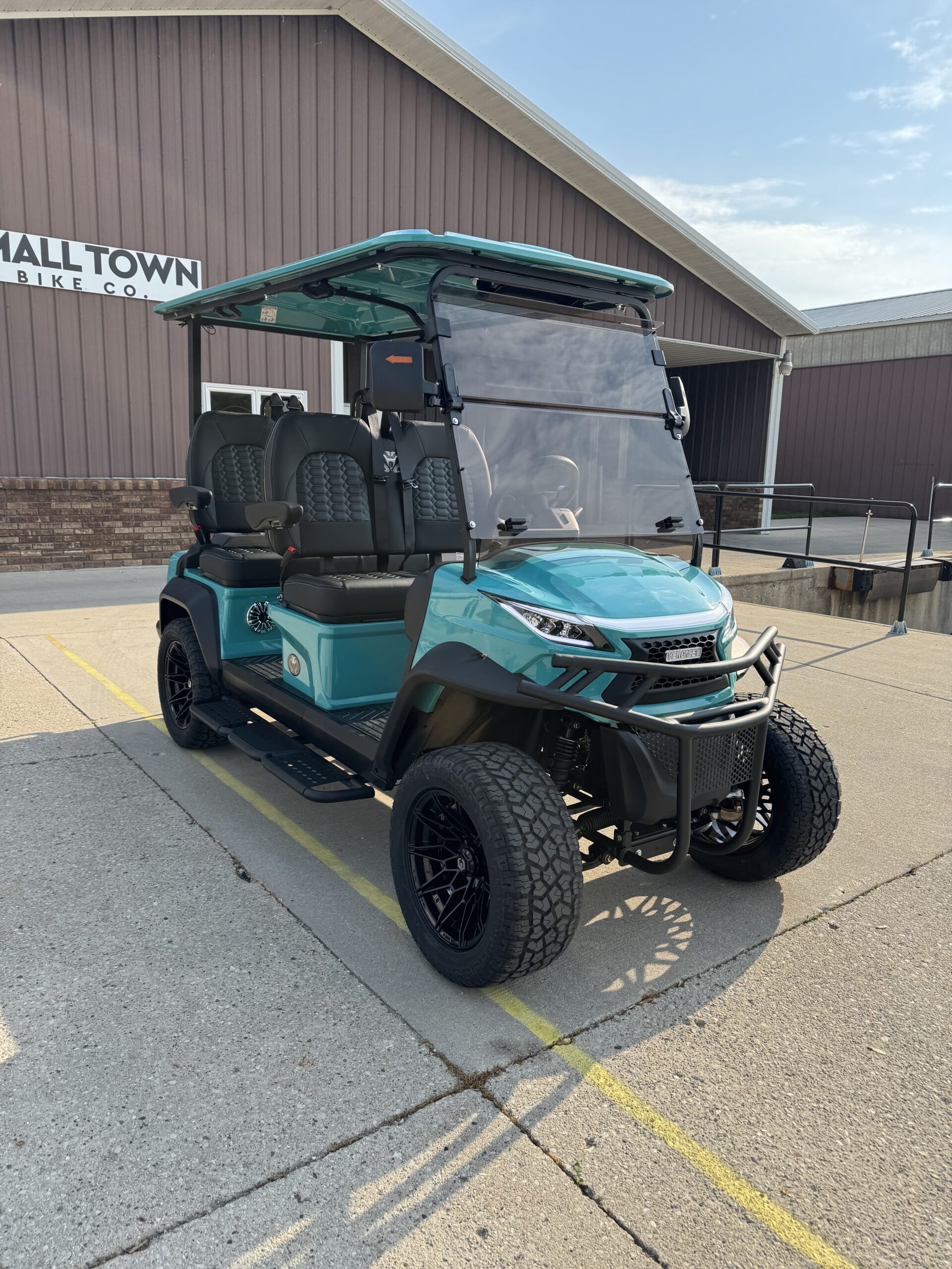 The Venom EV Stealth 4 Forward Lifted Golf Cart in Teal features lifted suspension, 23” tires, a 10” touchscreen display, and premium seating. Built for performance and comfort, this street-legal 4-seater is perfect for neighborhoods and recreational use.